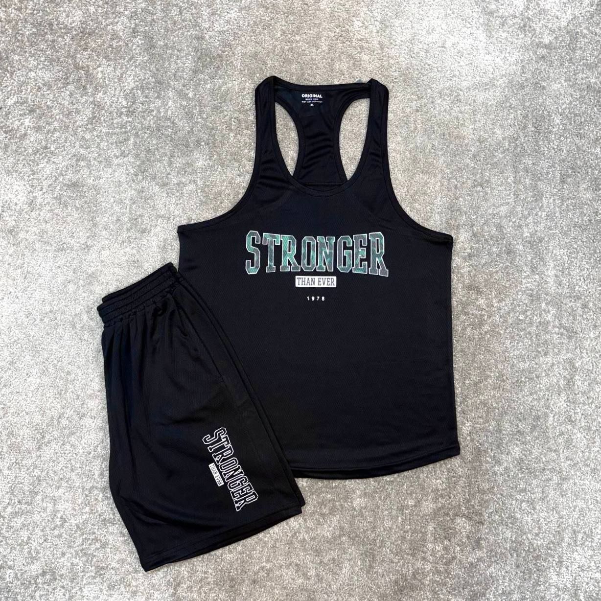 ست ورزشی مردانه رکابی قهرمانی و شلوارک کندویی Stronger مشکی