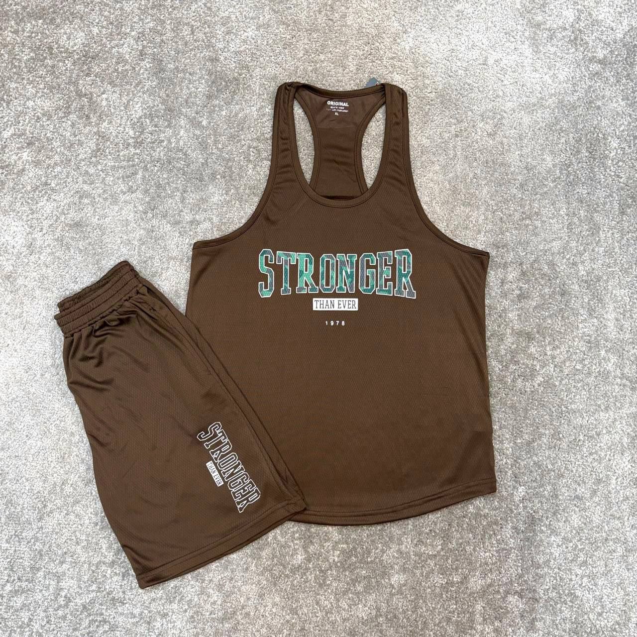 ست ورزشی مردانه رکابی قهرمانی و شلوارک کندویی Stronger قهوه ای