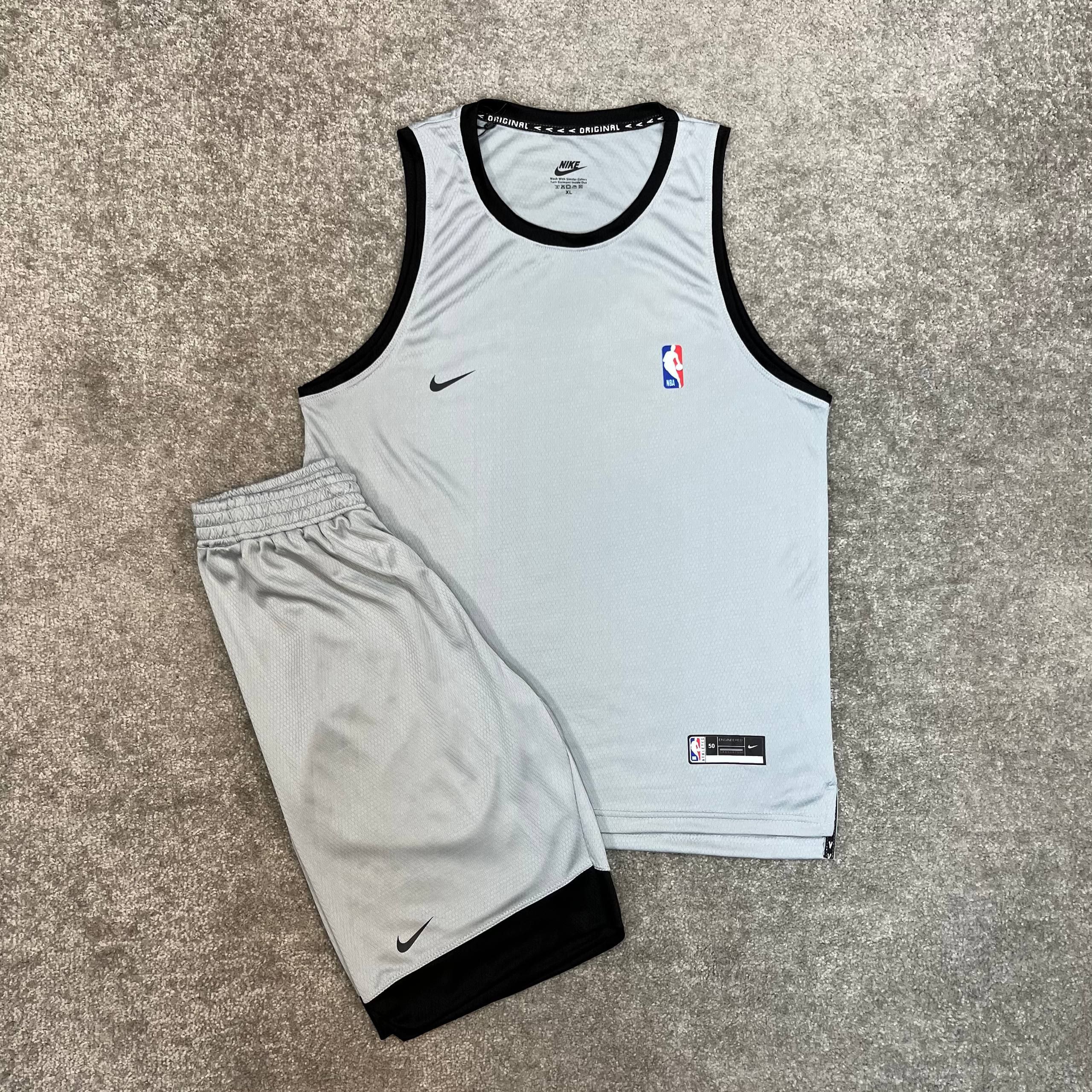 ست ورزشی مردانه رکابی و شلوارک بسکتبالی کندویی نایک طوسی