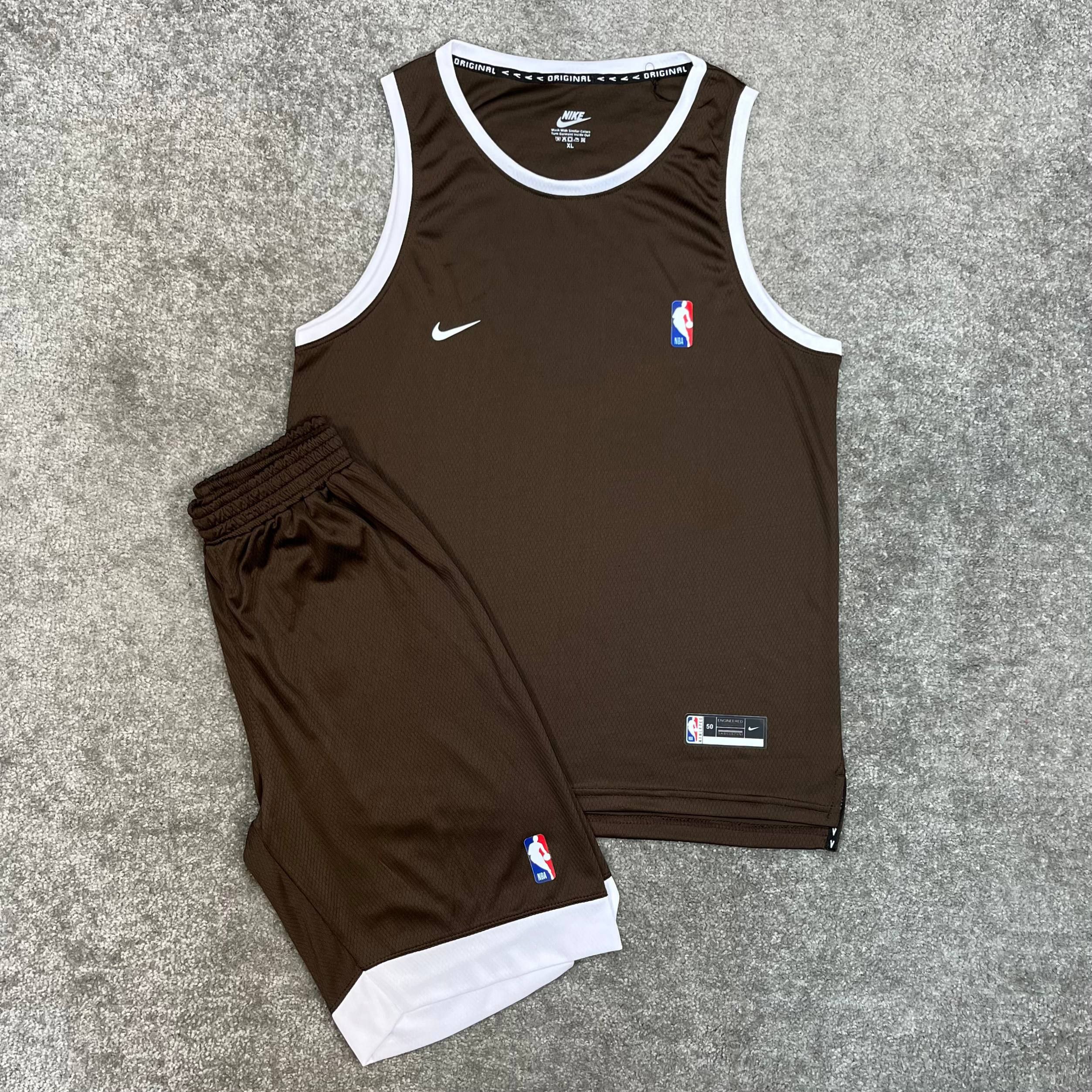 ست ورزشی مردانه رکابی و شلوارک بسکتبالی کندویی نایک قهوه ای